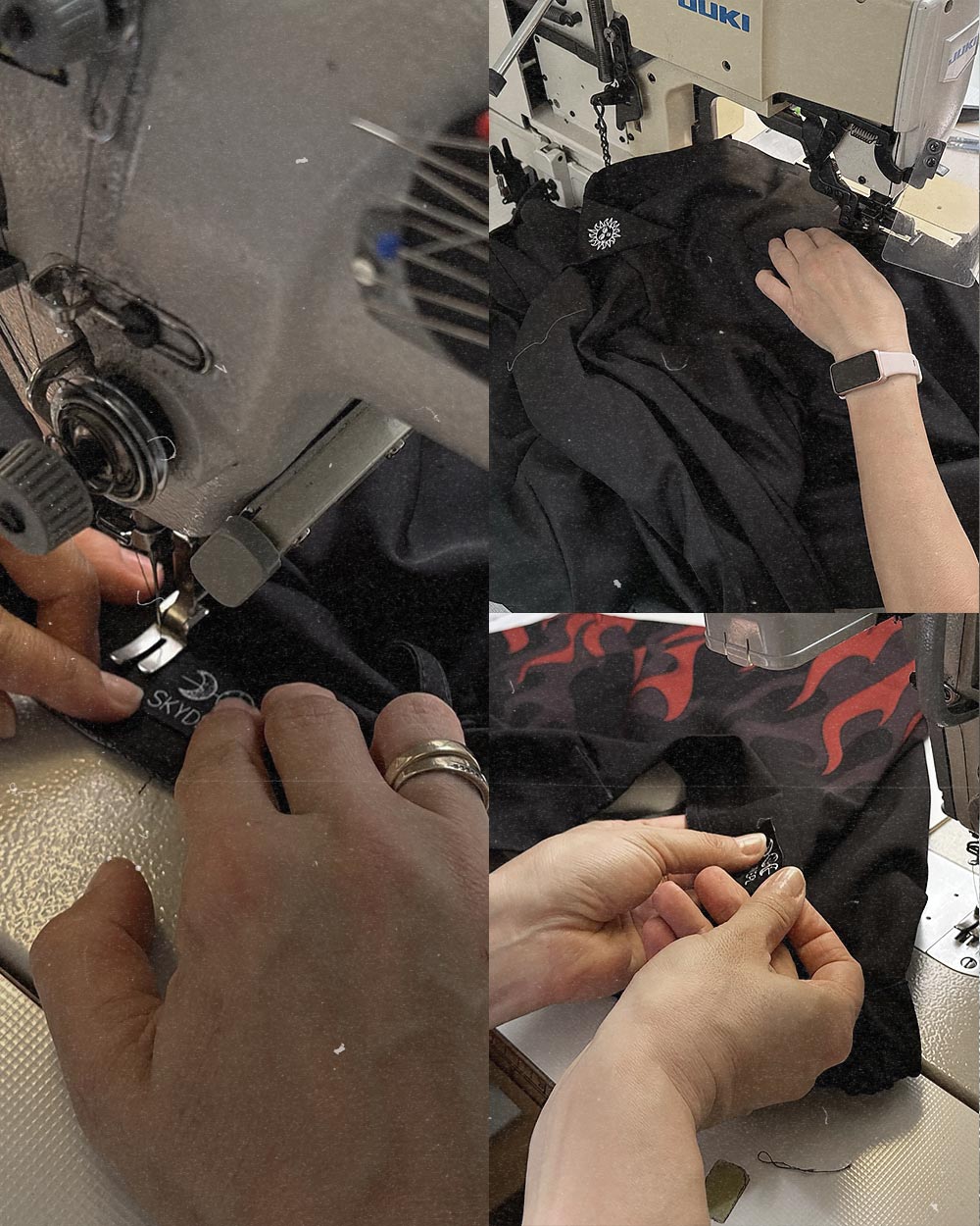 Along with us, our sewing studio is also developing. Seamstress who cuts the fabric into clothing pieces does her best to use every scrap of fabric and not waste a centimetre. But no matter how hard we try, there will always be some of material left. That is why we use the leftover materials to sew scrunchies, bags, and gloves. Thanks to this, nothing is wasted.