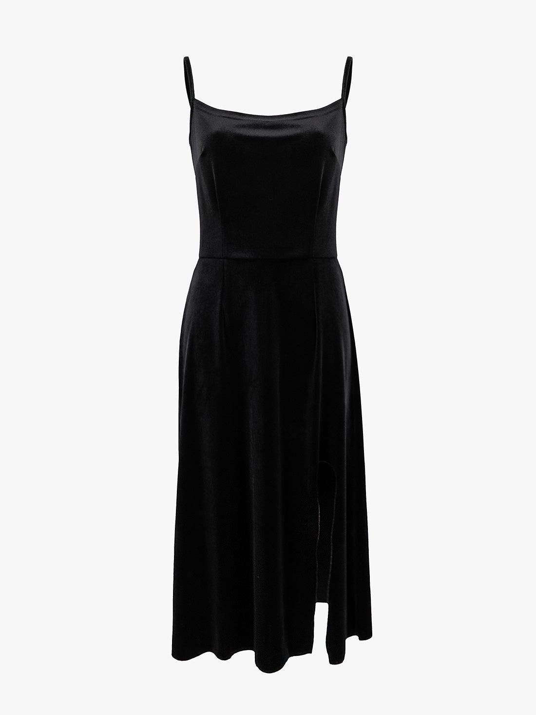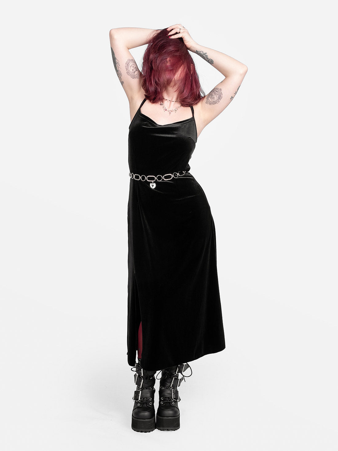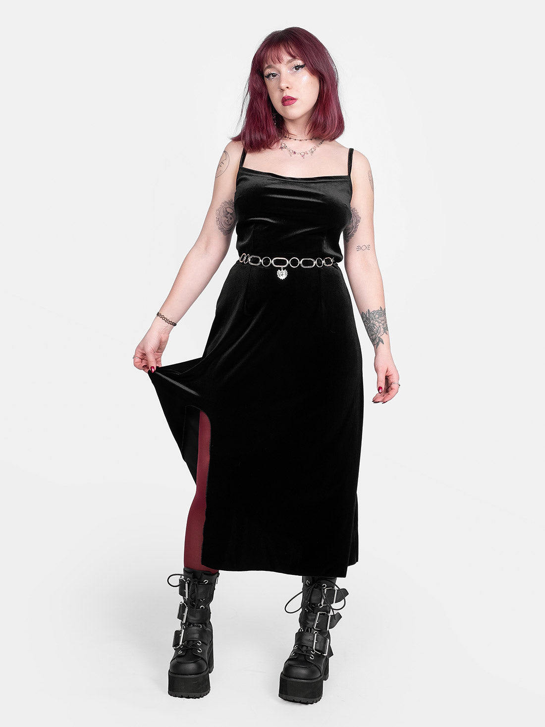 For a corpgoth look, pair this velvet midaxi dress with a blazer. Add statement accessories like a bold pendant necklace and structured ankle boots or heels. Embrace a dark lip color for an extra touch of sophistication.