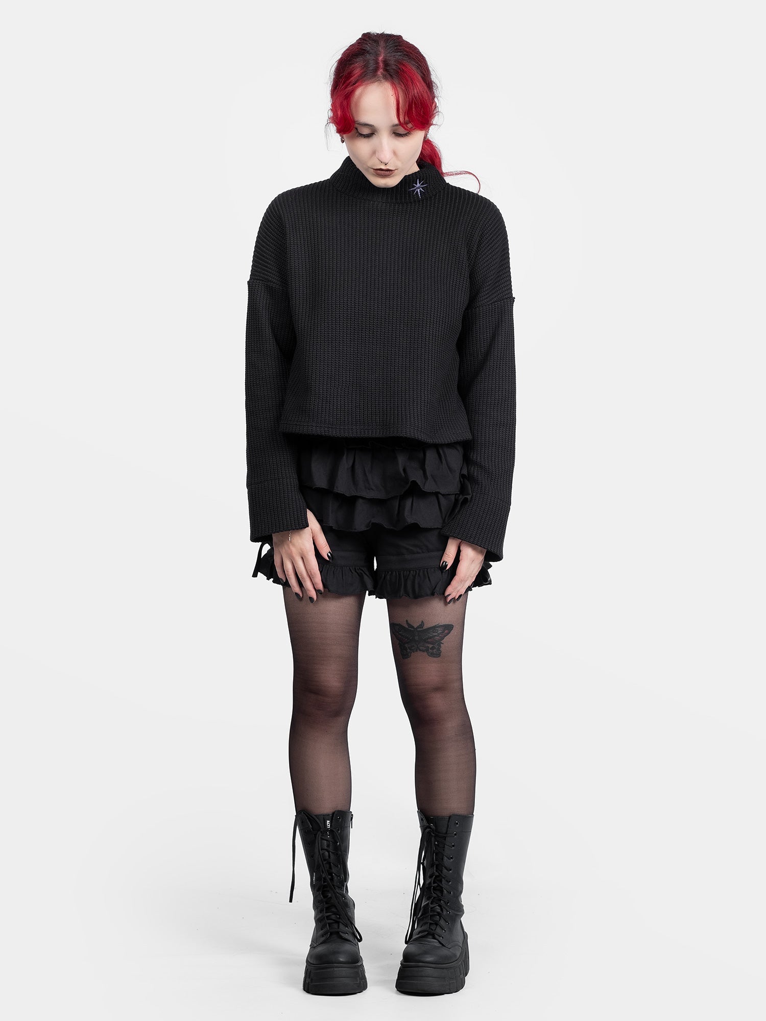 For everyday wear, pair it with a black Lacrimosa midi skirt and chunky boots for a gothic yet casual look. For college or a night out with friends, pair it with simple, high-waisted Phantom trousers and a backpack.
