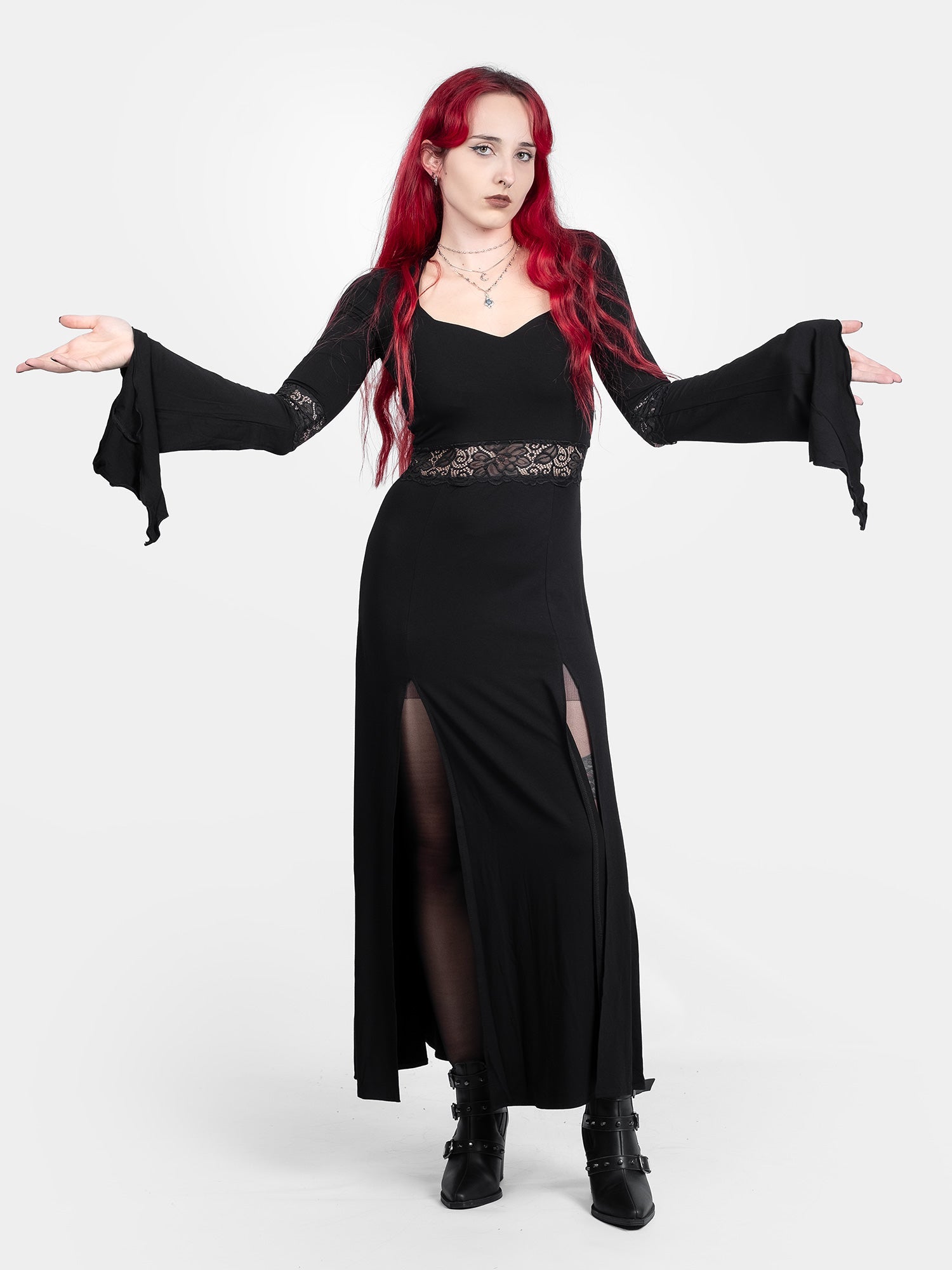 Deep cutouts at the front attract the eye, and lace sewn into the waist and elbows breaks up the whole and gives the dress a touch of lightness.