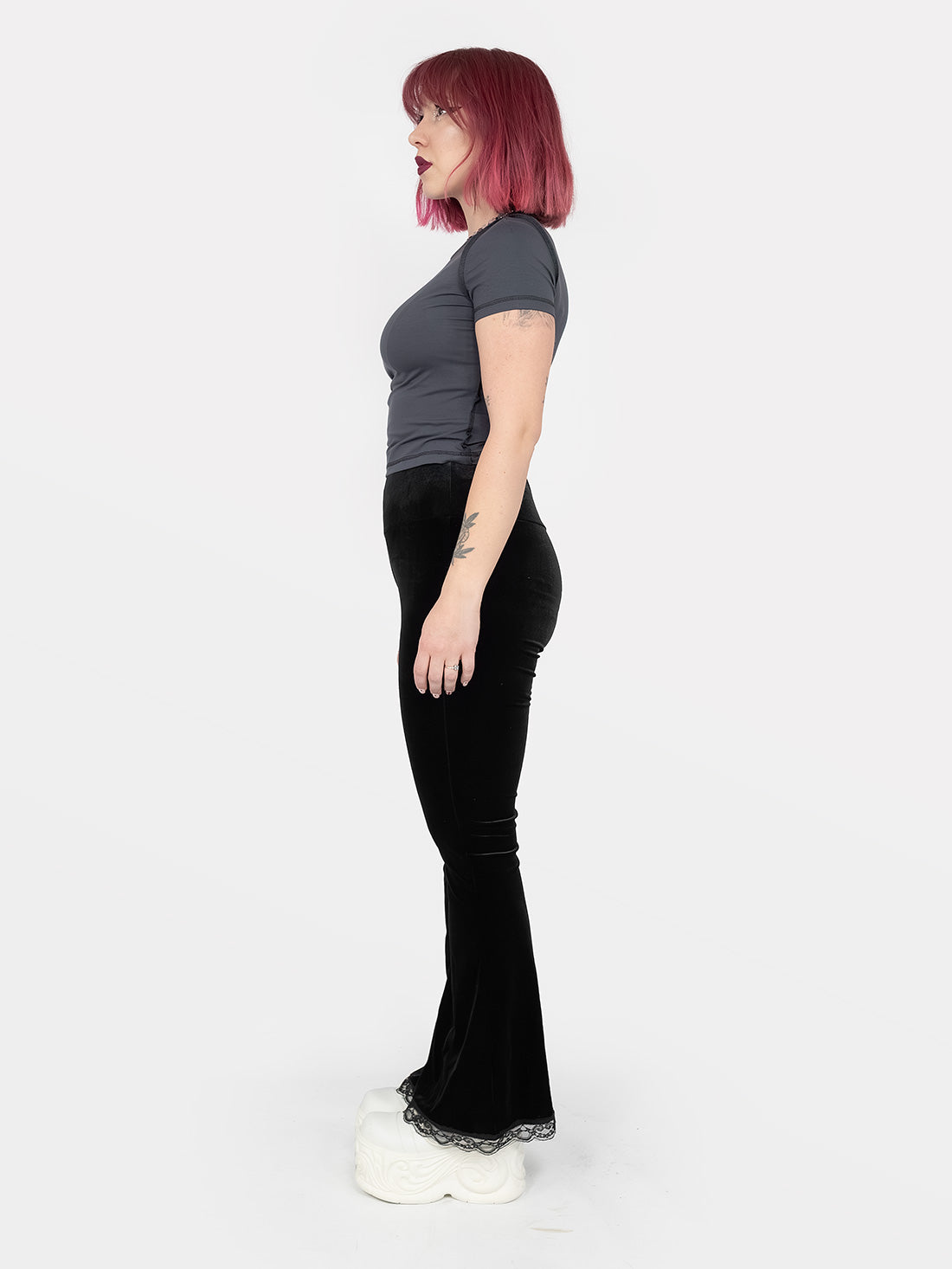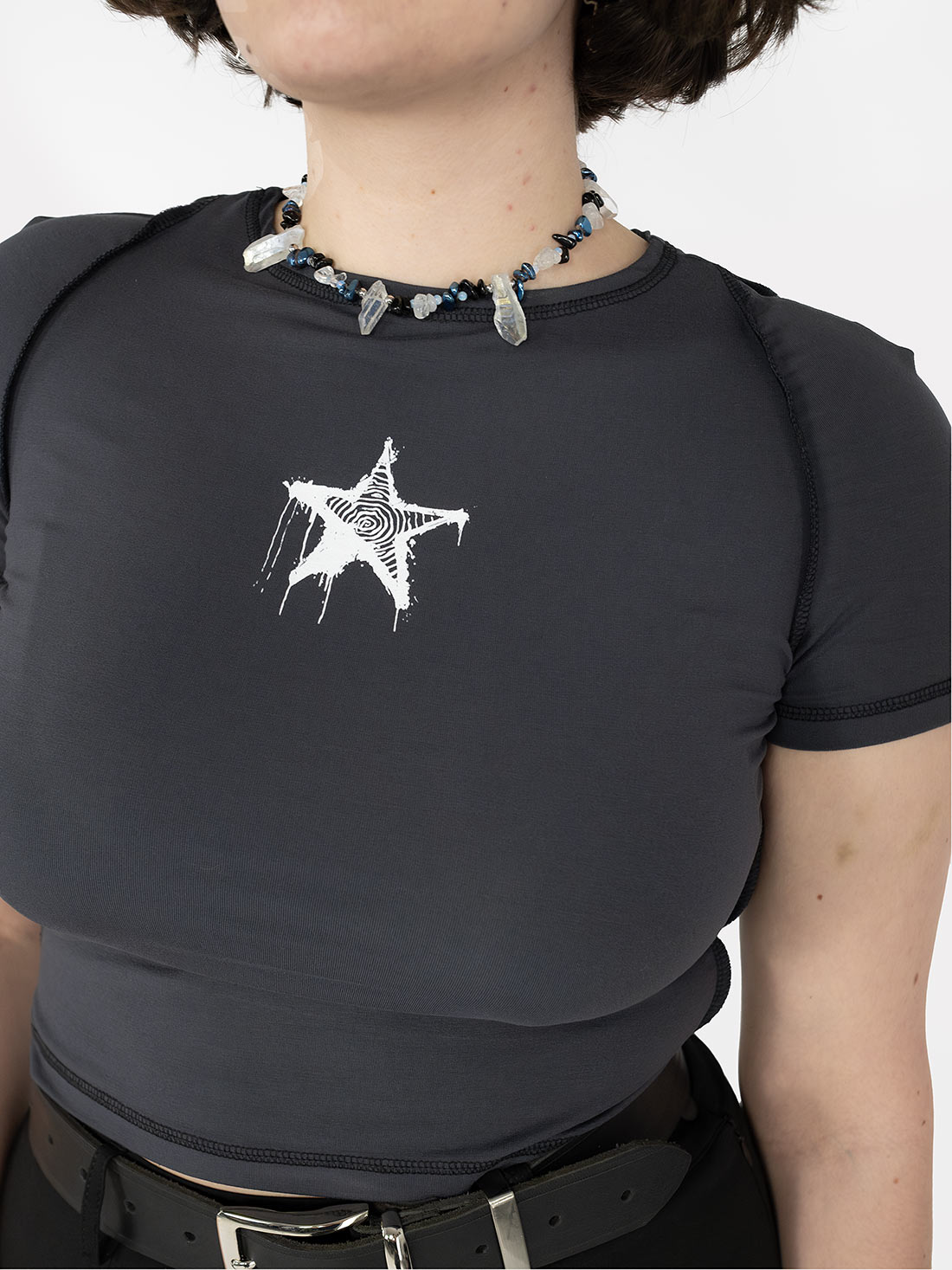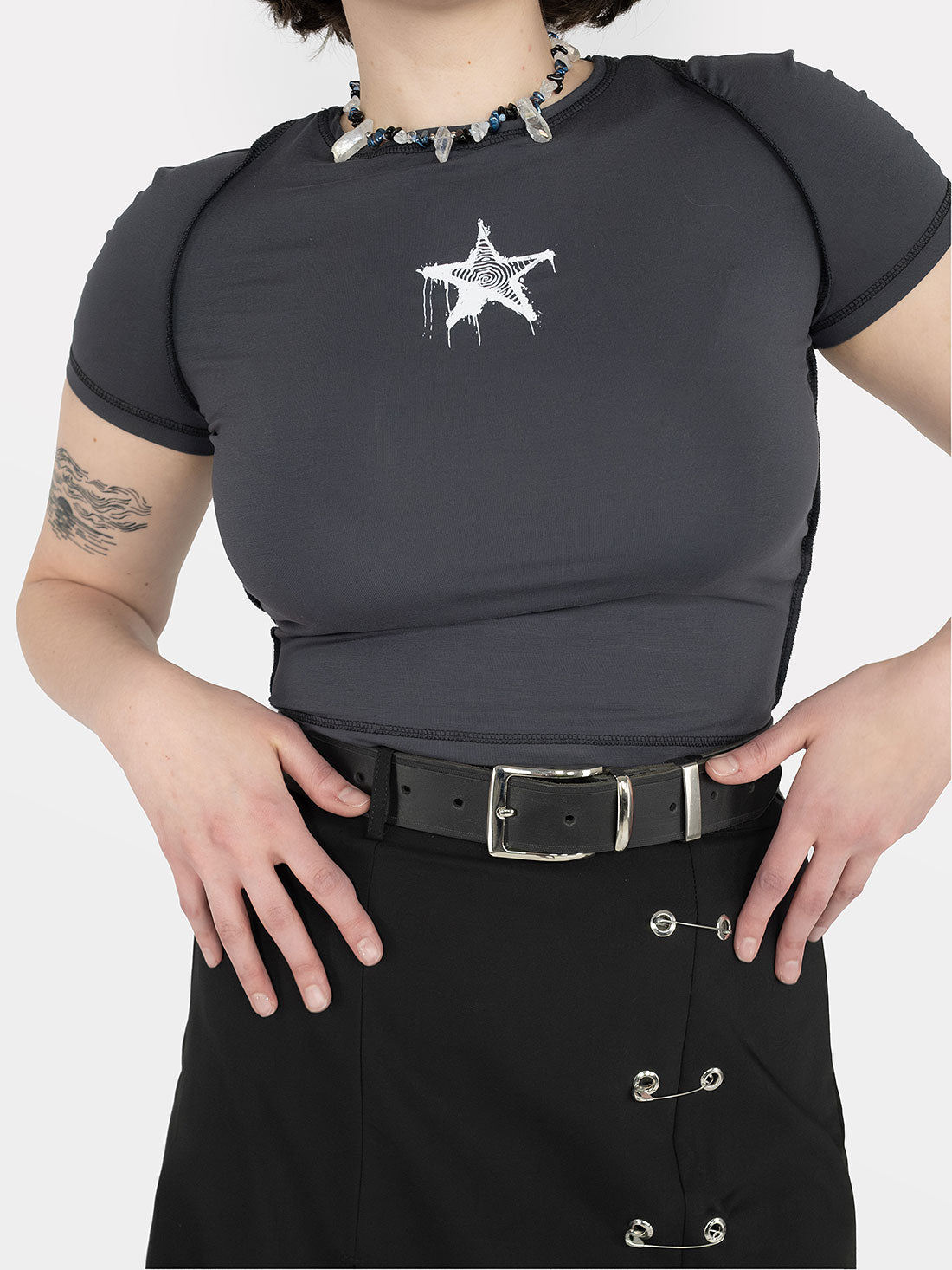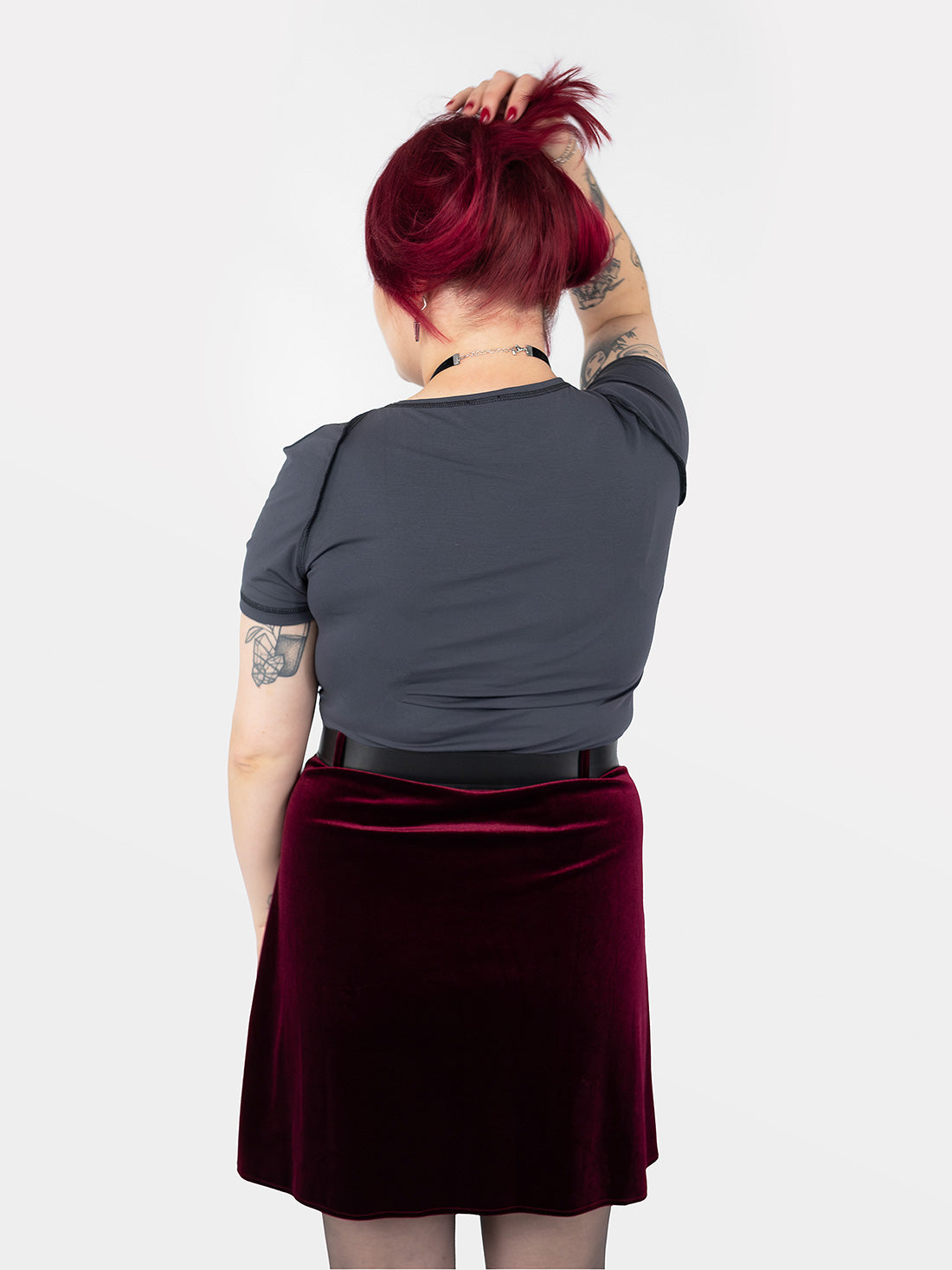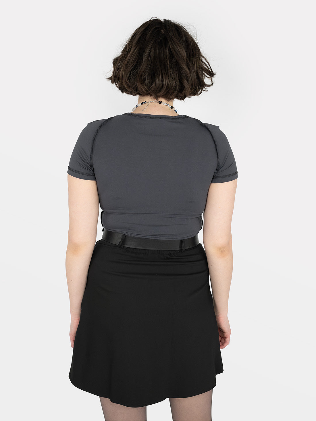 Medium-length top made from a grey, medium-weight viscose, finished with visible black trim.