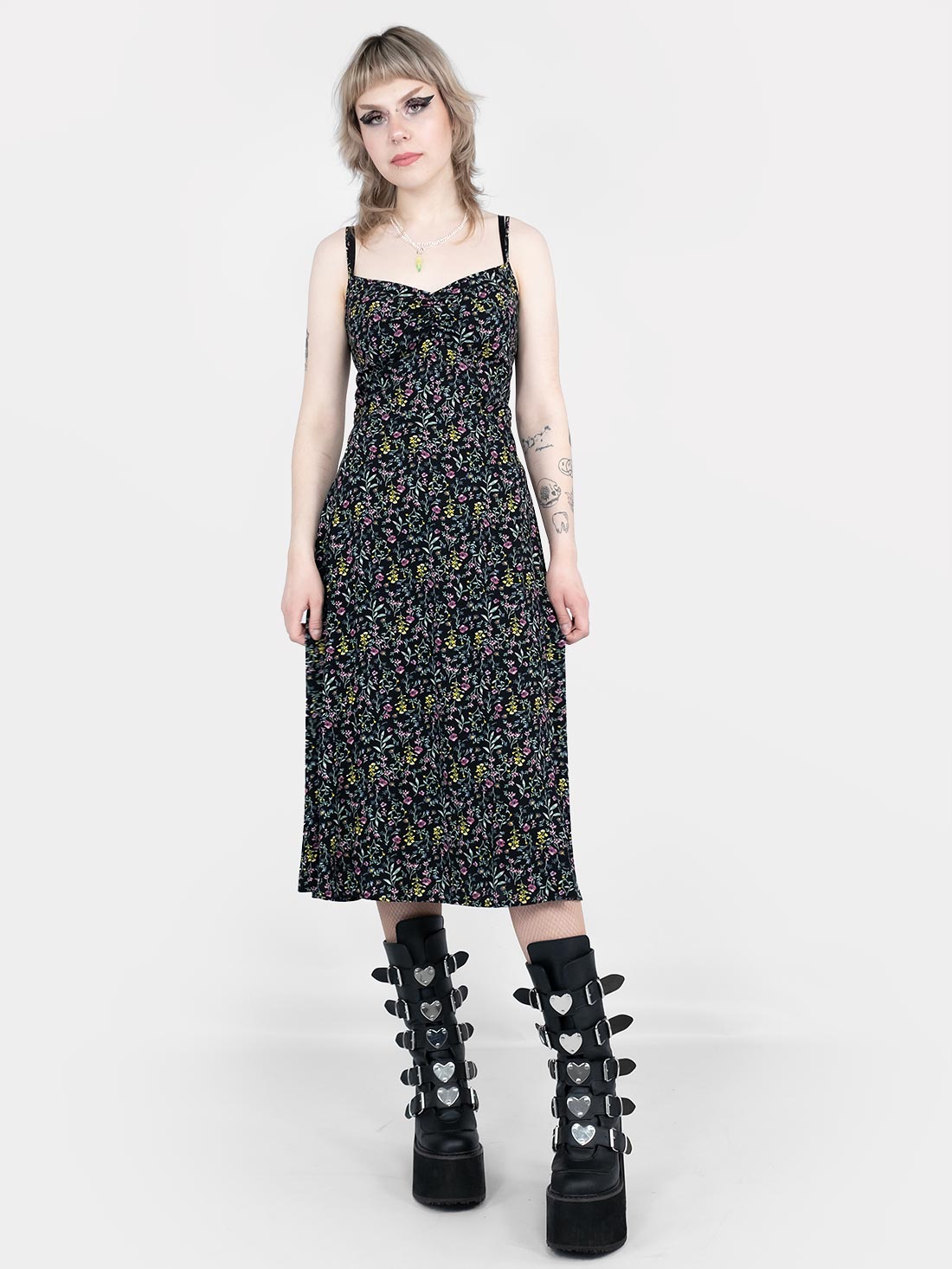 This dress is incredibly gorgeous on its own, so simple accessories will be enough to make a statement. On colder days, throw over one of our cardigans, such as Menace or Mercy. It goes so well with our Phobia mock neck top as well!
