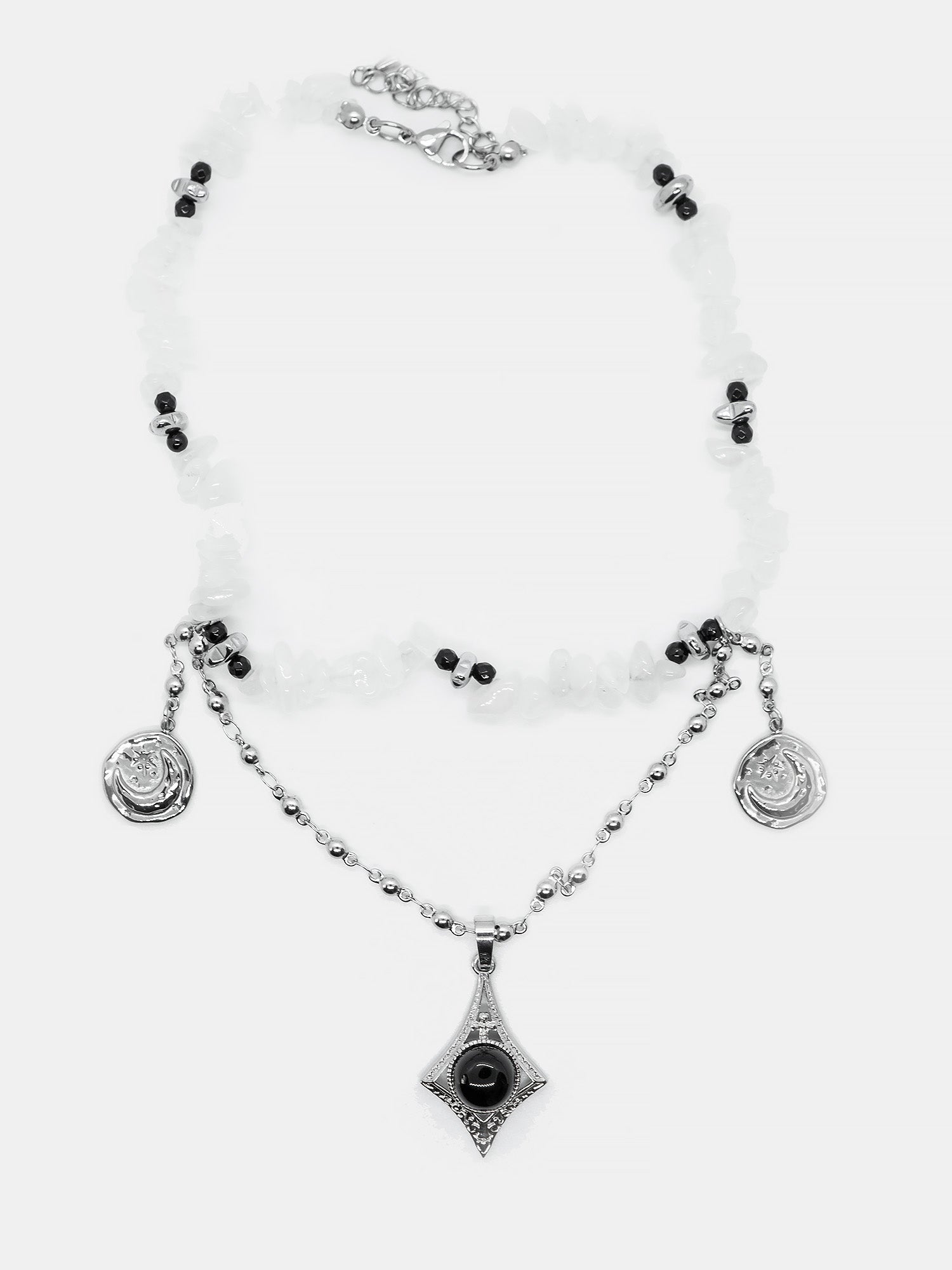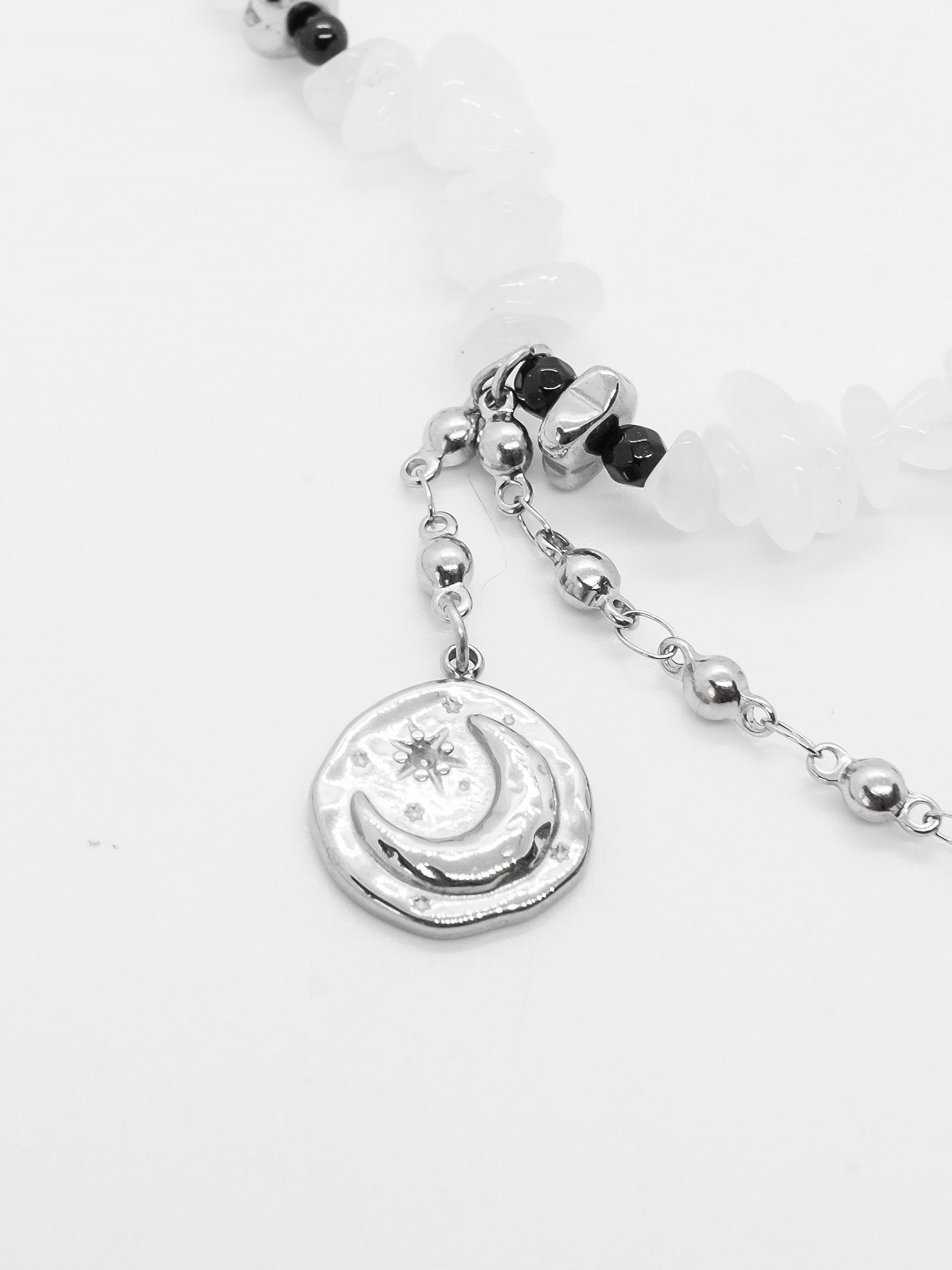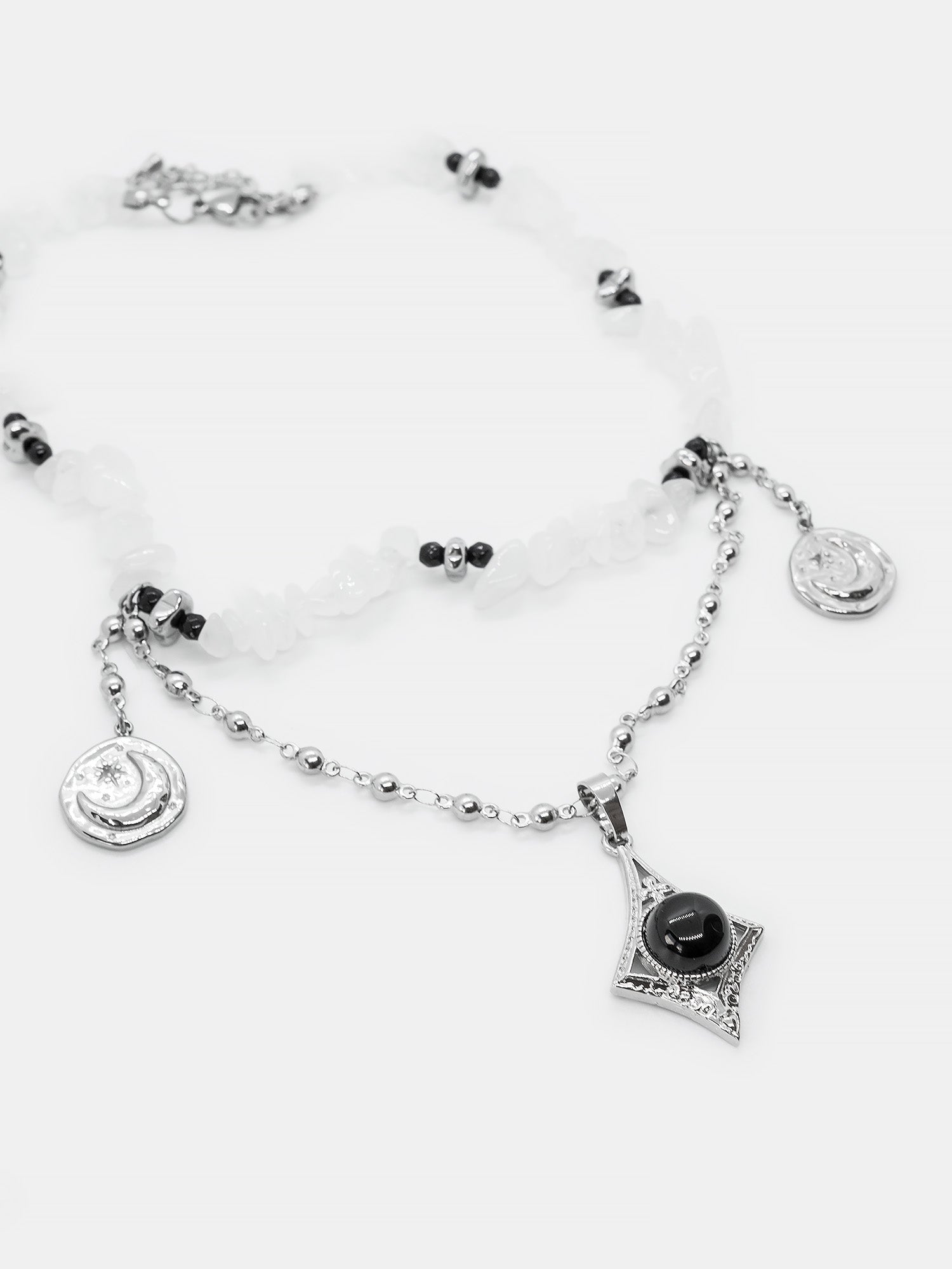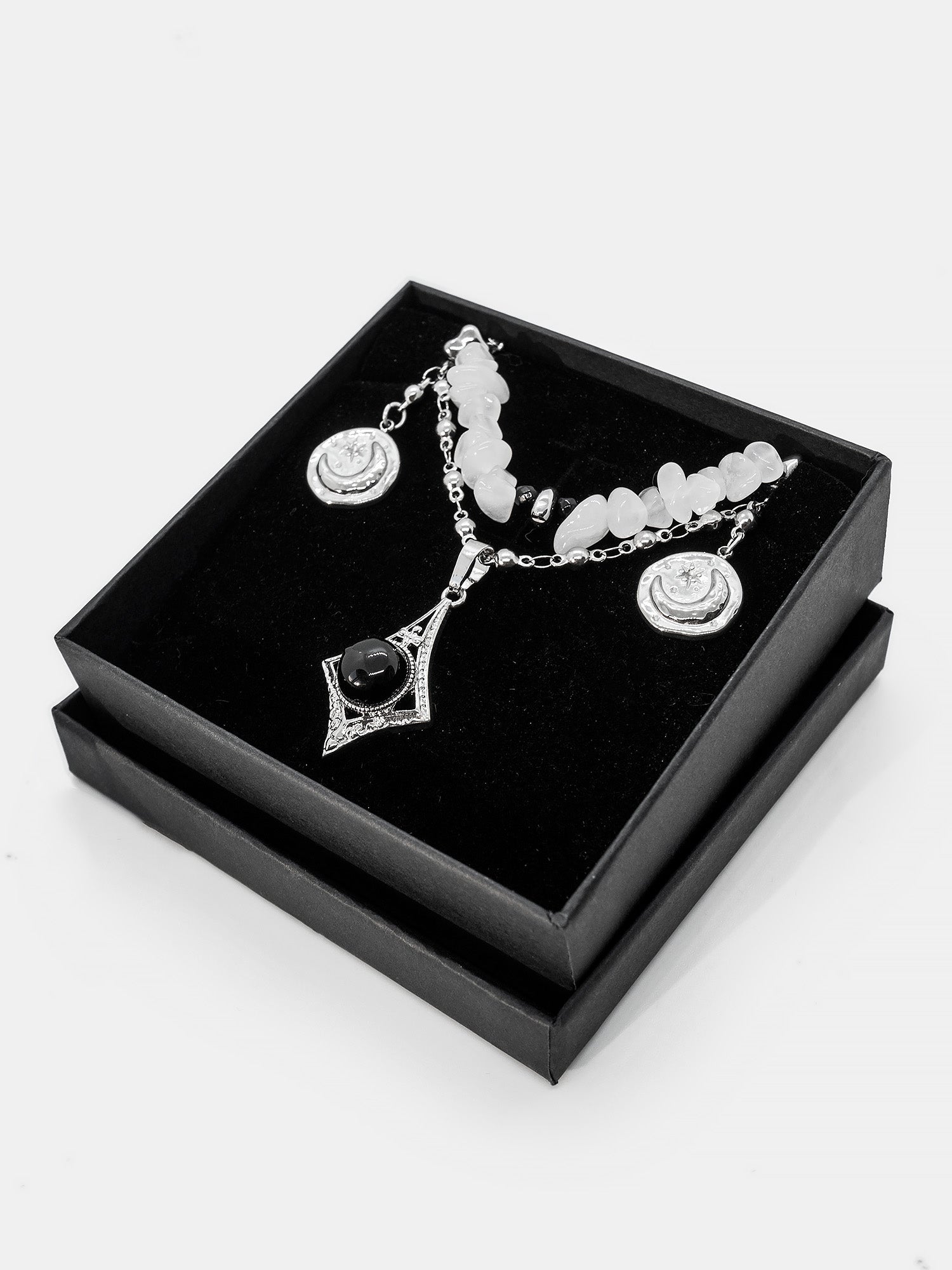 In the center, there is an obsidian pendant suspended on a chain, and on the sides - round moon pendants.