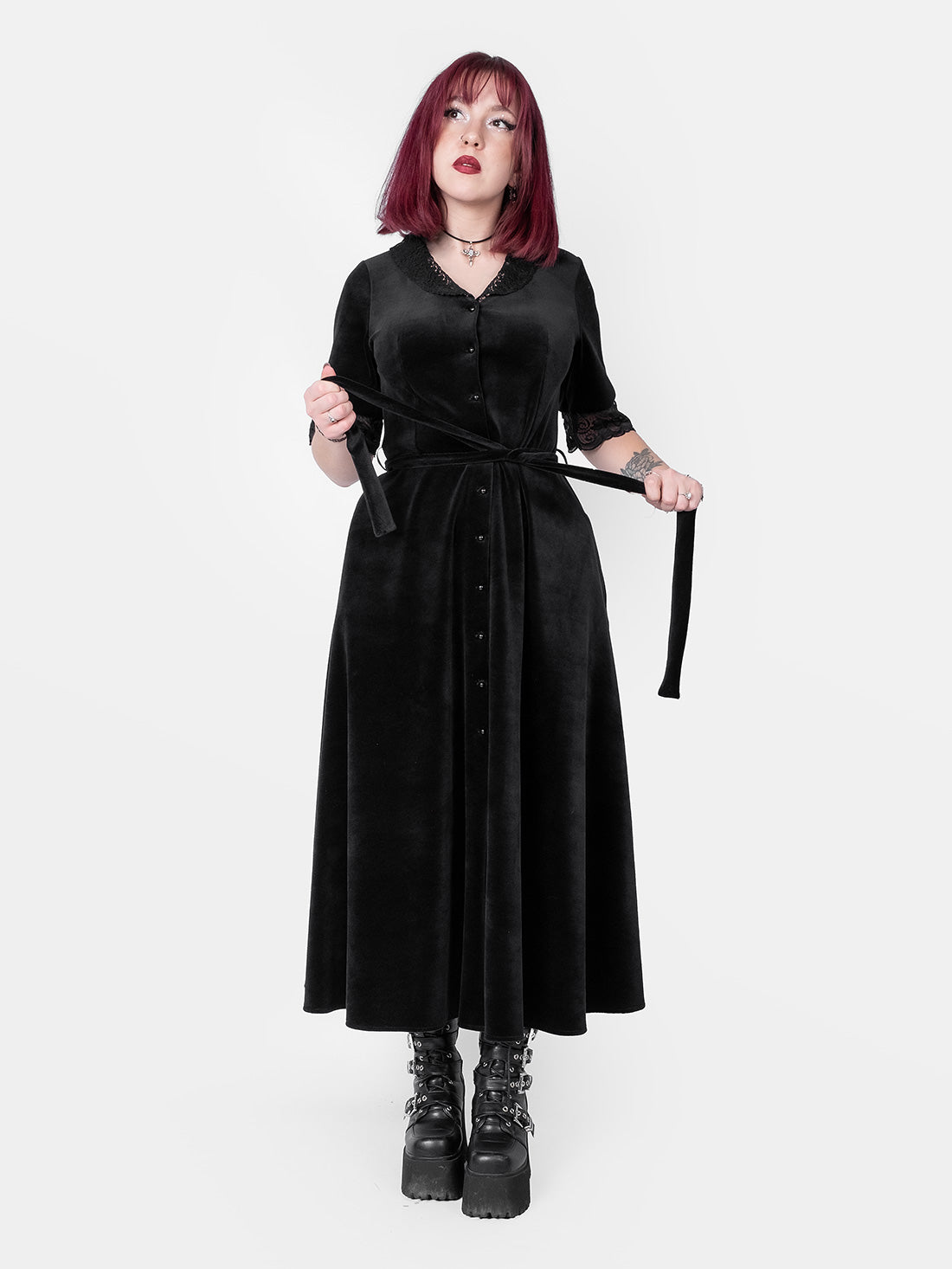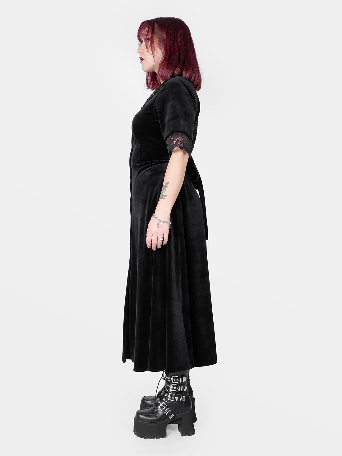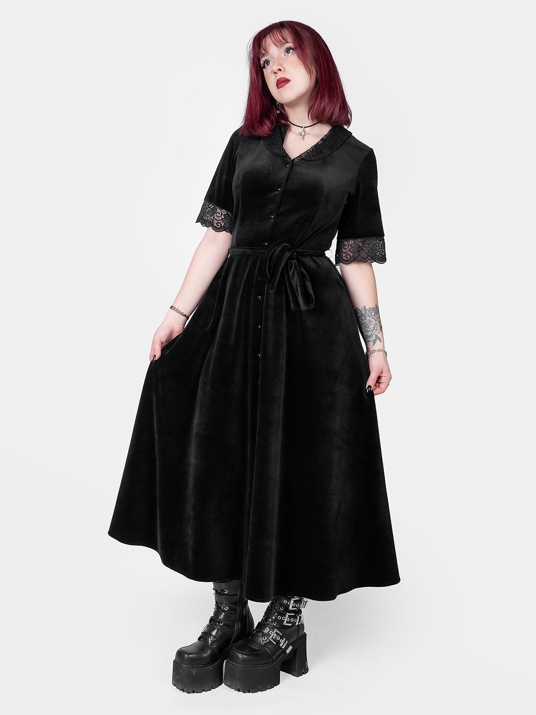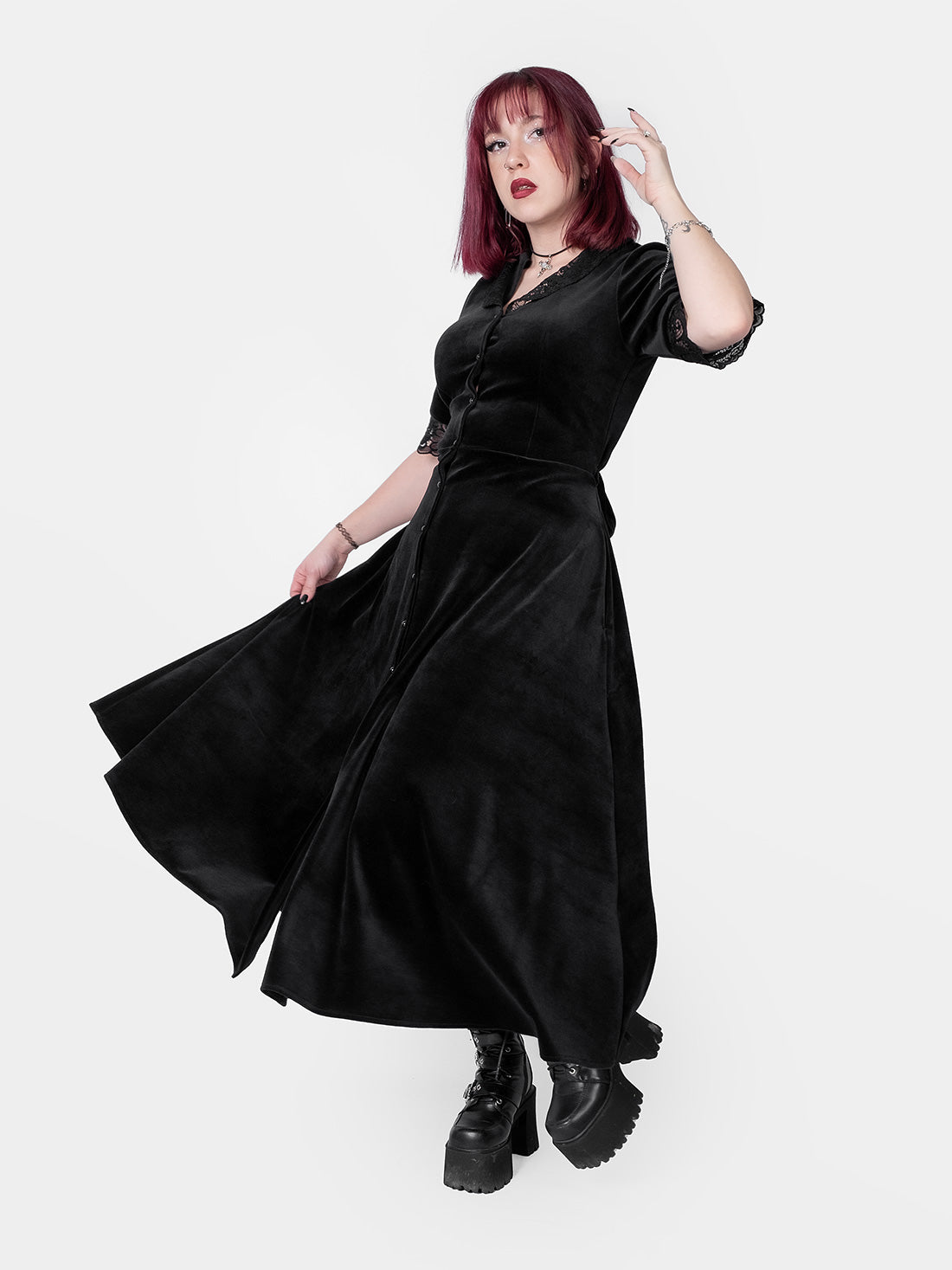 Delicate lace trims on the sleeves and neckline add a gothic charm, flowing from our whimsigoth inspiration.