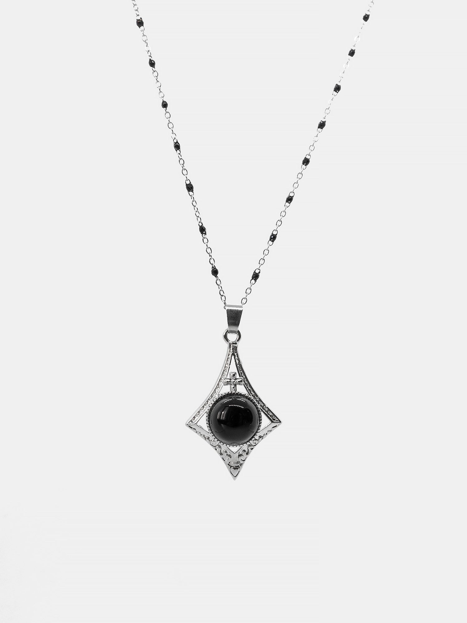 The central element of the necklace is a pendant with an obsidian set in an ornate, silver frame with a slender, Gothic shape.